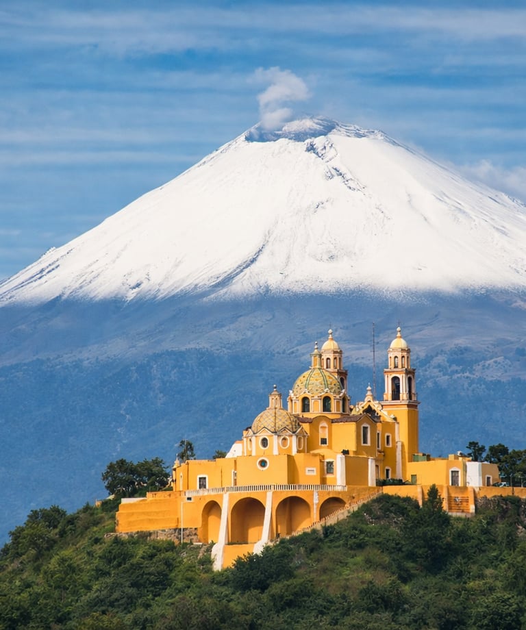 Templo sobre la pirámide que mezcla historia prehispánica y devoción.
